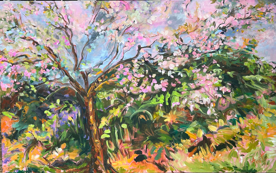 Art and creativity have always been central to Annette’s life. Born in La Jolla, “The Gem of California”, she grew up in an art and nature loving family, with her house often filled with musicians and artists. Some were with the San Diego symphony where her mother performed, and others were friends, such as the home designer and glass artist, James Hubbell. Her grandmother, aunt and uncle were all accomplished painters. As a child, she always enjoyed drawing and painting and her earliest works took inspiration from her interest in poetry, spirituality and the beauty of the natural world. At 17 she received her first commissioned artwork after moving to Ashland and becoming a hairstylist.